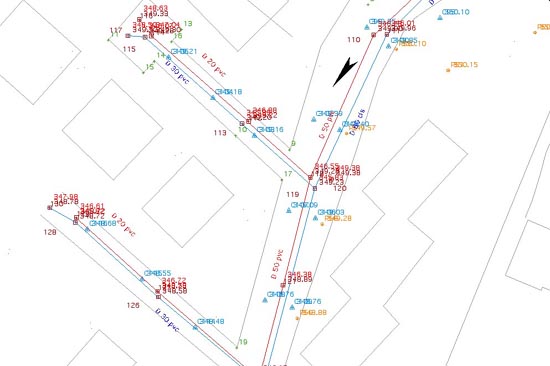 Il lavoro attualmente in corso, comporta il rilievo planoaltimetrico della rete delle acque nere, chiare e miste e delle interconnessioni con le chiare superficiali . Inoltre contestualmente sono state rilevate le colonnine antiincendio, i pali dell'illuminazione stradale, le caditoie, le saracinesche di acqua e gas. Il rilievo è stato eseguito con tecniche celerimetriche e GPS. In un secondo tempo il rilievo è stato completato con l'ispezione puntuale delle condotte e delle camerette creando apposite schede di database. Tutti i dati sono stati poi informatizzati con vari softvare (Autocad ,Excell e Database dedicato) per poter permettere un accesso integrato alla base dati del modello di gestione e del modello idraulico.